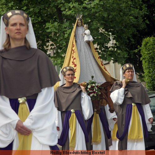 Maria wordt hier geƫerd door haar te omgeven met de symbolen van de Eucharistie: brood (korenaren) en wijn (druiventrossen). Het Lievevrouwenbeeld dat wordt meegedragen staat thans in de Sint Petrusbasiliek. Het werd eeuwenlang bewaard in het Vrouwengasthuis van Magdalena van der Stappen, gelegen aan de Markt