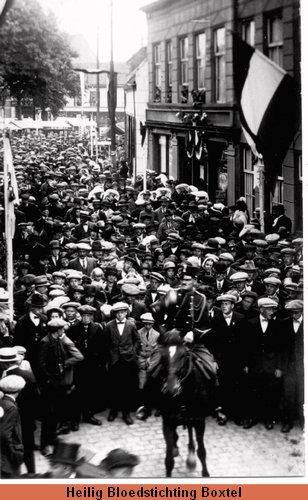 Een en ander is bevestigd in een in het Lateraans archief bewaarde oorkonde van 9 juni 1459, waarbij paus Pius II op verzoek van de minderbroeder-observant Hermanus Sench een aflaat van 5 jaar en 5 quadragenen verleende aan eenieder, die op de feestdag van de Heilige Drievuldigheid, of op het feest van Sint Jan de evangelist, de parochiekerk te Boxtel bezocht en daar offerde voor het toen - vermoedelijk aan de Strijpt, de huidige Markt - in aanbouw zijnde, aan Sint Pieter toegwijde armenhospitaal. Drievuldigheidszondag als viering van het Heilig Bloed kennen wij ook uit de aantekeningen over de grote brand in Boxtel op 23 mei 1540. In de schepenprotocol van dat jaar staat vermeld dat juist toen de processie binnen was, of tenminste op het kerkhof was aangekomen, er op het hoekje van de Kerkstraat een brand ontstond, die zich over het hele centrum van Boxtel uitbreidde. Hierbij werden onder meer het Clarissenklooster, de meeste huizen 'tront om die Strijpt', rondom de Markt, en een groot gedeelte van de Rechterstraat, alsmede de Burgakker met uitzondering van enkele huizen bij het kleine poortje van Stapelen, een prooi van de vlammen. Bij deze brand zouden niet minder dan 170 panden, waaronder alle herbergen, in vlammen zijn opgegaan, waardoor duizenden pelgrims al hun bagage verloren. De brand zou zijn ontstaan doordat een vonk van een brandende fakkel is het stro op straat viel. Een duidelijk teken van de populariteit van de bedevaart naar Boxtel in deze streken is wel, dat volgens een Tilburgse kerkrekening uit 1609 er in dat jaar op de eerste zondag in juni niet werd gecollecteerd: omdat weijnich volx in de kerk waren mits de Boxtelse vaert. En dan te bedenken dat honderden ja duizenden pelgrims de lange weg naar Boxtel en terug te voet aflegden, ook al zal er een aantal zijn geweest, dat de slechte hobbelige weg met paard en kar heeft afgelegd. Omtrent de herkomst van de bedevaartgangers bevatten de rekeningen slechts geringe aanwijzingen. De meeste zullen wel uit de Meijerij zijn gekomen. In 1615 overhandigt een koopman een gave van 13 stuivers door een vrouwe van Hantwerpen gesonden tot een beevaert. In 1626 wordt melding gemaakt van een gift van een vrouw uit Udenhout, bestaande uit 7 loepense rogge, welke haar man 7 jaar geleden beloofd had der kerke tot een offerande. In 1637 komt Jenneken Evert Maessen naar Boxtel ter beevaert, die daartoe in de gelegenheid was gesteld door de Vrouwe van Helmond, Anne Maria van Reuschenberg, gehuwd met Alexander van Cortenbach. Onder de geofferde geldstukken bevond zich ook meestal onbekend geld dat in 1615 bij Abraham Thomas, kennelijk een jood, werd ingewisseld. Bedevaarten werden gewoonlijk gemaakt om een gunst te verkrijgen of voor een verkregen gunst te bedanken of gewoon uit devotie.